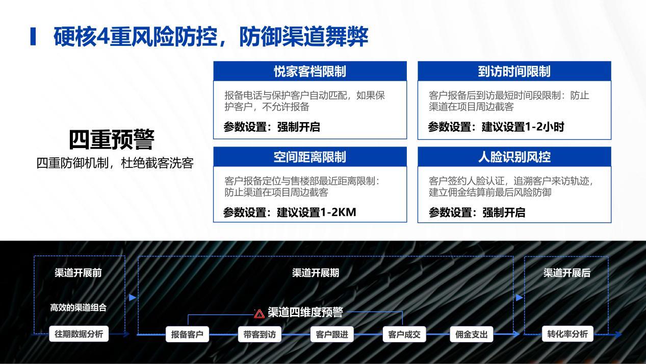 渠道智慧管理系统,结合智慧风控系统,进行客档限制、到访时间限制、空间距离限制和人脸识别四重渠道风险防御,杜绝截客洗客现象;提供渠道全程自动解决方案,为开发商节省亿元营销费用;自建多用途经纪人团队,重塑房企自有可持续渠道。