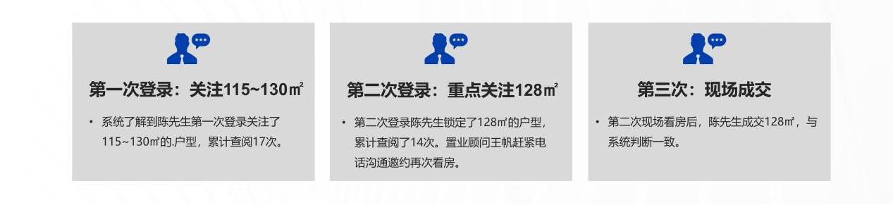 以「佛山保利天寰」真实案例为例,2020年1月17日,陈先生携家人到访案场,由于看房时间较短,陈先生也没有展现出强烈购房意向,置业顾问判定陈先生为“C类客户”。随后「锐云科技」案场智慧管理系统系统却监测到陈先生在线上售楼部查看楼盘31次,单次访问时长47分钟,并智能判定陈先生为“A类客户”。置业顾问赶紧跟进,最终陈先生成交。