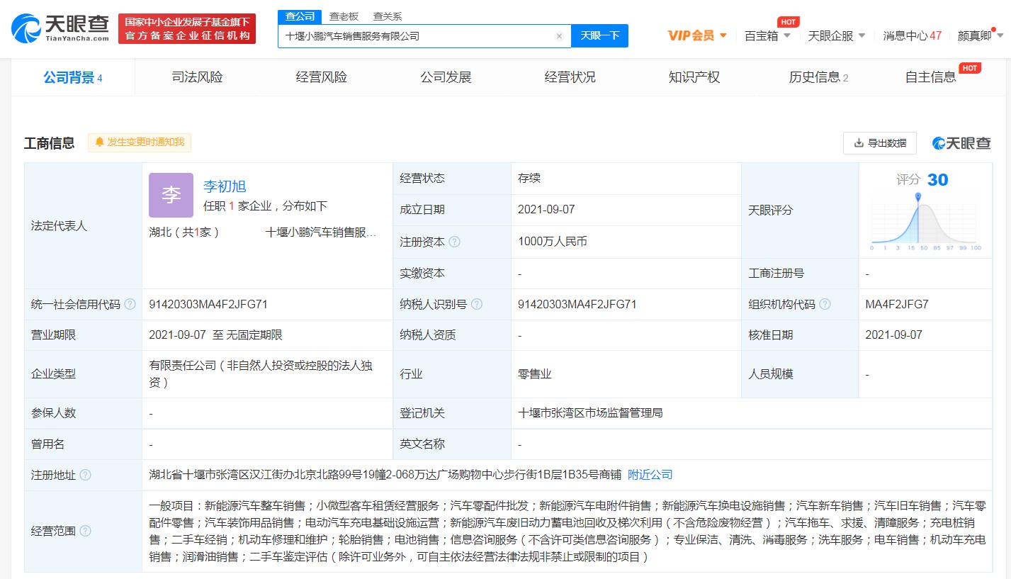 36氪获悉,天眼查App显示,近日,十堰小鹏汽车销售服务有限公司成立,法定代表人为李初旭,注册资本1000万人民币,经营范围包括新能源汽车整车销售;小微型客车租赁经营服务;汽车零配件批发;二手车鉴定评估等。股东信息显示,该公司由小鹏汽车销售有限公司100%控股。