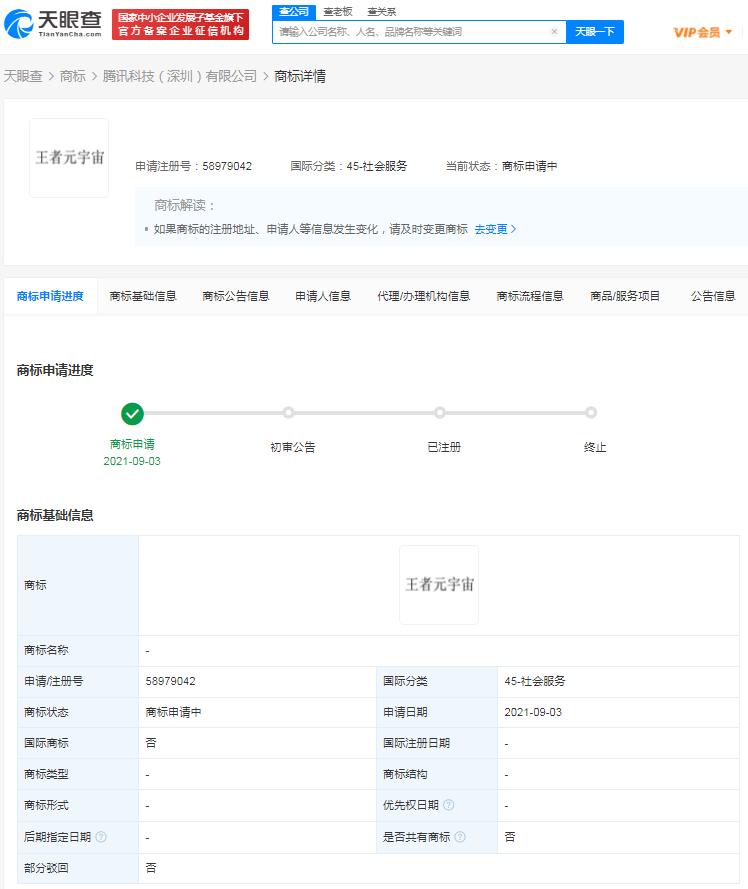 36氪获悉,天眼查App显示,近日,腾讯科技(深圳)有限公司申请注册“王者元宇宙”“天美元宇宙”商标,国际分类含社会服务、通讯服务,当前商标状态均为申请中。