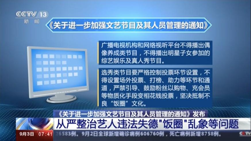 2021年9月2日,国家广电总局正式下发通知:《国家广播电视总局办公厅关于进一步加强文艺节目及其人员管理的通知》,通知明确要求所有电视台、网络平台,不得播出偶像养成类节目,不得播出明星子女参加的综艺娱乐及真人秀节目。