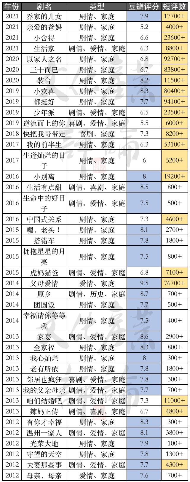 笔者以7.5及其以上为“高分”(蓝色),短评数超过4000条为“热议”(黄色)作为标准,筛选了从2012年至2021年豆瓣高分、热议的家庭题材电视剧。