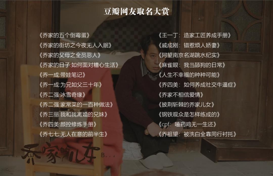 于是,豆瓣网友不但紧跟剧情为《乔家的儿女》创作了《乔家的五个倒霉蛋》《cpf:嗑药鸡无一生还》《乔祖望:被洗白全靠同行衬托》《王一丁:造家工匠养成手册》《乔四美:如何养成社交牛逼症》……的花式剧名,还纷纷开启“乔学”研究,把乔家那些事儿延伸到职场家庭婚姻社会的各个角落,激发二次传播。