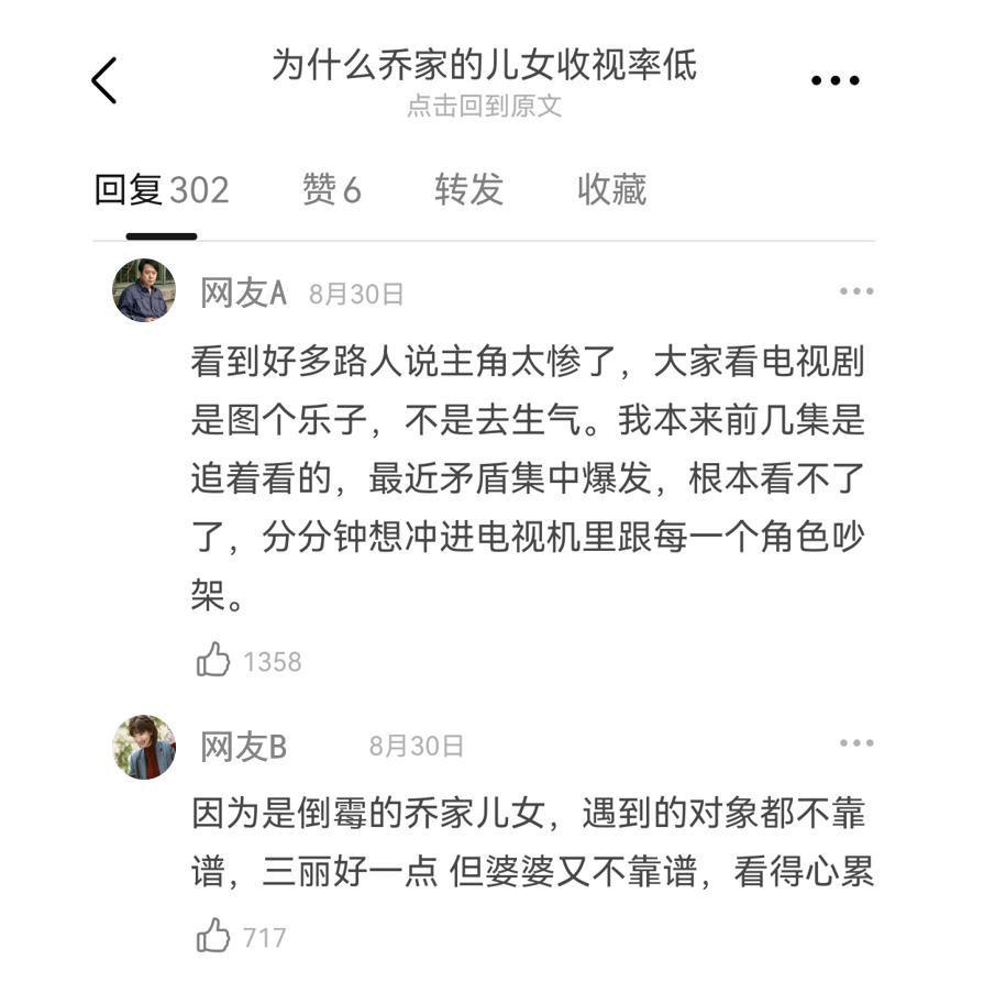 让观众在情绪上感受到极致的猎奇和压抑,这不可不说是一步险棋。正面的情绪体验可以维系观众对剧集的热情和黏性,而消极的情绪成本则会打击观众观剧的积极性。因此,如果观众怀着看《父母爱情》的心情被吸引,却看见一家人无比倒霉惨淡的光景,很可能会倍感心累而弃剧。这也造成了《乔家的儿女》实际播放量不如论坛声量的局面。