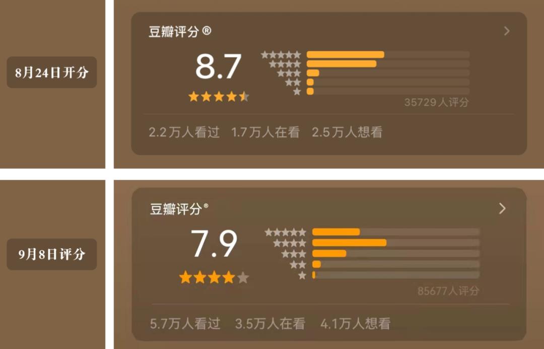虽然,在这样强情节的支撑下,观众会有一种走马观花,目不暇接之感,也更容易被吸附在对各色人物命运的关注之中;但另一方面,过度的滥梗会让故事的深度下降,失去了矛盾的精髓,只剩下空有冲突的外壳,造成高开低走的结果,豆瓣评分也从开始的8.7滑到如今的7.9。