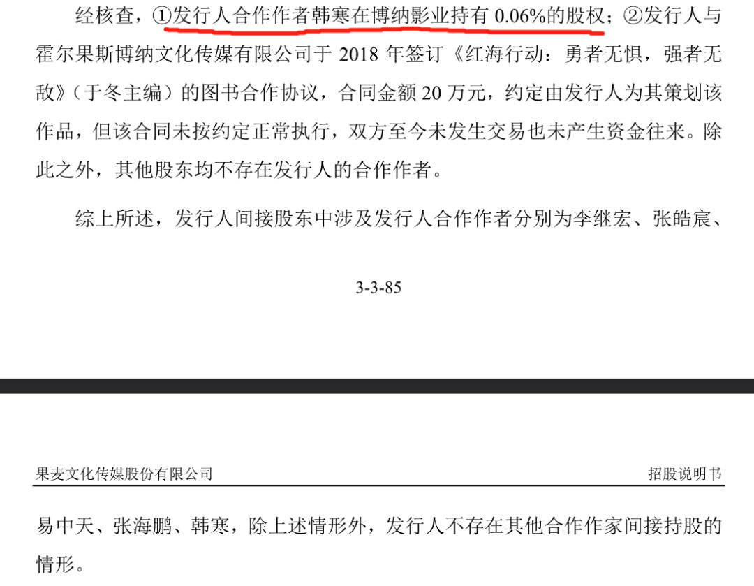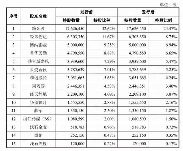 截至目前,路金波为第一大股东,直接持股32.62%,周巧蓉则持有4.53%的股份。而韩寒则通过持有博纳影业0.06%的股权间接持股果麦文化。
