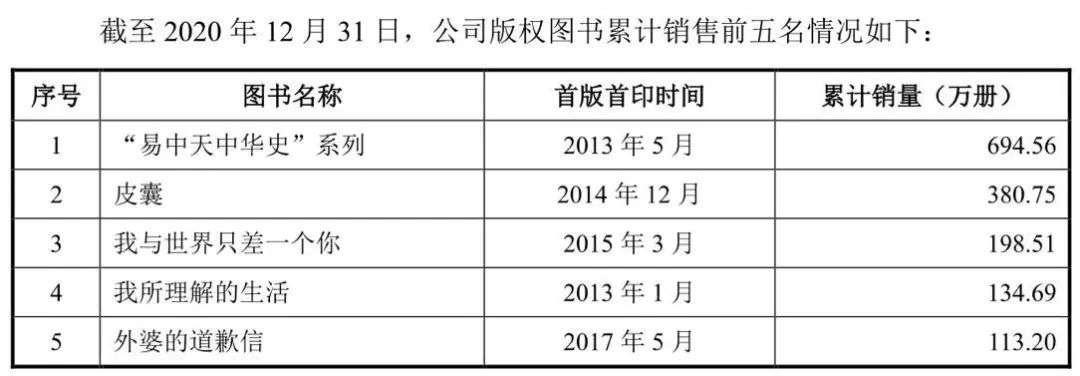 在实体书受到数字化变革的冲击后,获取具备影响力的IP成了各大出版公司争夺的重点之一。果麦先后与杨红樱、严歌苓、韩寒、冯唐、饶雪漫、易中天、戴建业等一众知名作家、学者建立了长期稳定的合作关系,这帮助其在出版图书一项竞争中有不少优势。截至2020年底,易中天《中华史》系列、蔡崇达《皮囊》、韩寒《我所理解的生活》等图书产品的销量均超百万册。