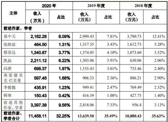 招股书显示,2018-2020年,报告期内,易中天为果麦文化贡献总计8952.4万元的营收;韩寒则贡献了994.57万的营收。