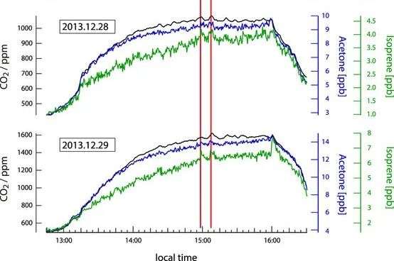 在放映《饥饿游戏2》时,电影院空气中二氧化碳(黑色)、异戊二烯(绿色)和丙酮(蓝色)的含量变化曲线,两条红线对应着重要的剧情发展 | Jonathan Williams et al.