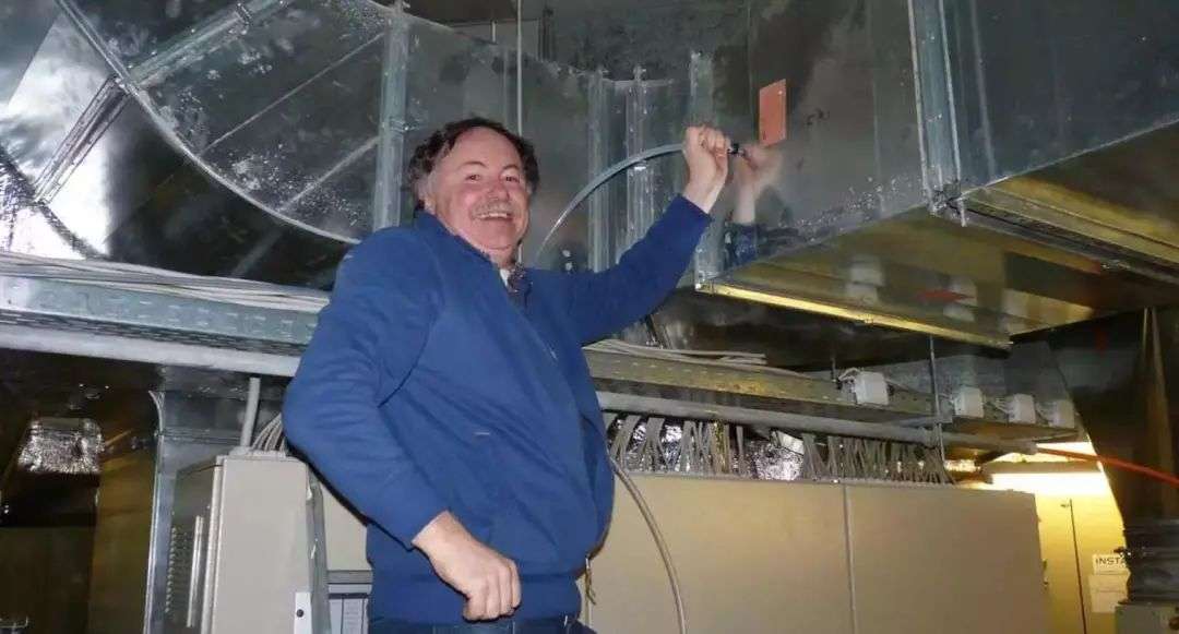 研究者Thomas Klüpfel从影院通风系统上接出管子,把空气样本引到测量仪器上 | MPI for Chemistry