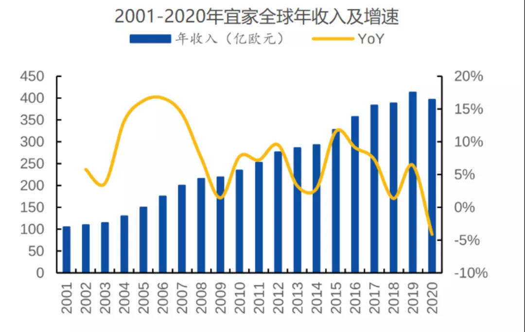 图:2001-2020年宜家全年收入及增速(来源:宜家、艾媒数据、国元证券研究所)