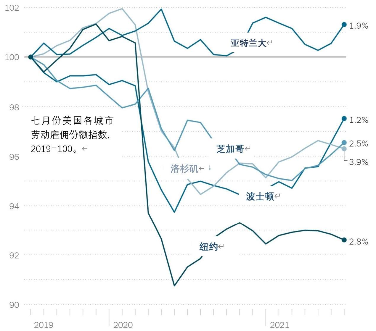 此外,美国的经济地理情况看起来已不同于两年前。纽约市在全国就业中所占的份额从 2019 年 7 月的 3.1% 下降至 2021 年 7 月的 2.8%。这意味着,与假使纽约市能至少跟上整个国家的步调相比,其工作岗位如今已减少了约 375,000 个。