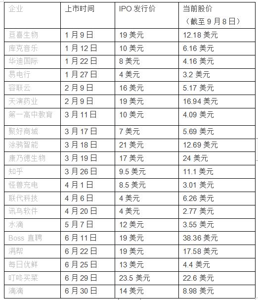根据“极点商业”统计,截至美东时间9月8日,30多家赴美敲钟的中概股中,当前股价高于IPO发行价的企业,不超过5家。