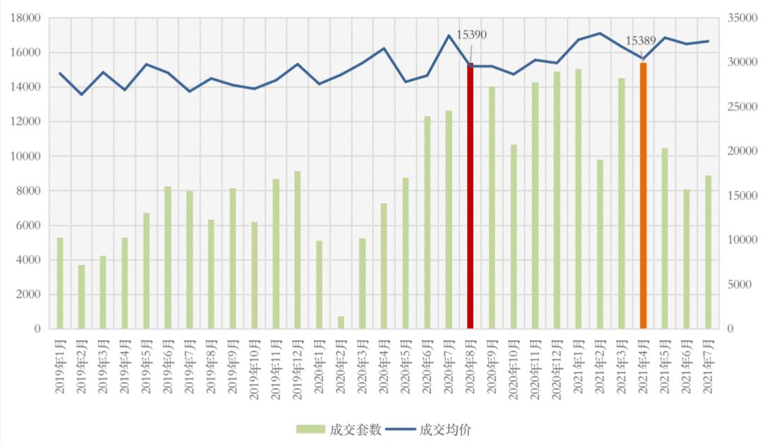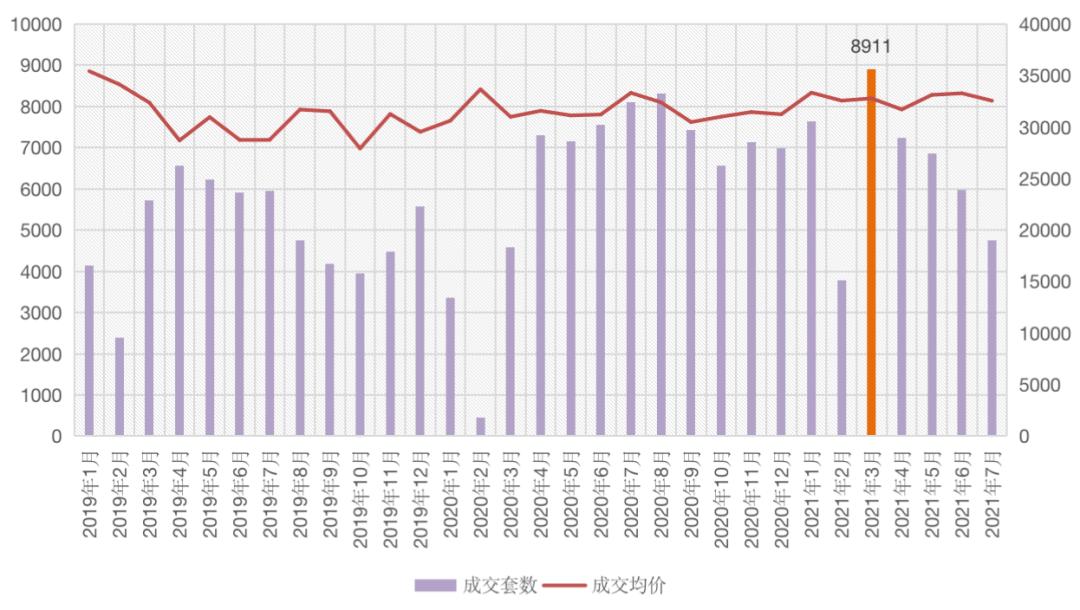 图:2019年1月-2021年7月杭州二手住宅成交量价走势(单位:套,元/平方米)