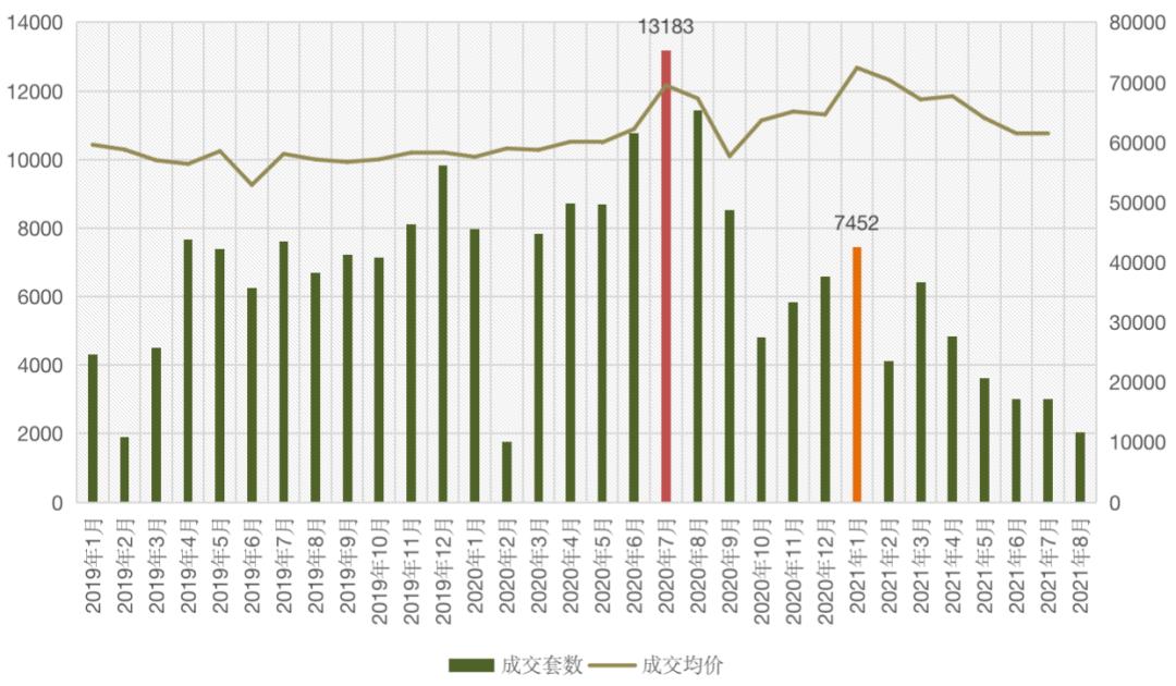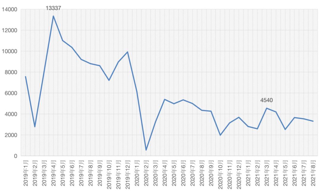 图:2019年1月-2021年8月成都二手住宅成交套数走势(单位:套)