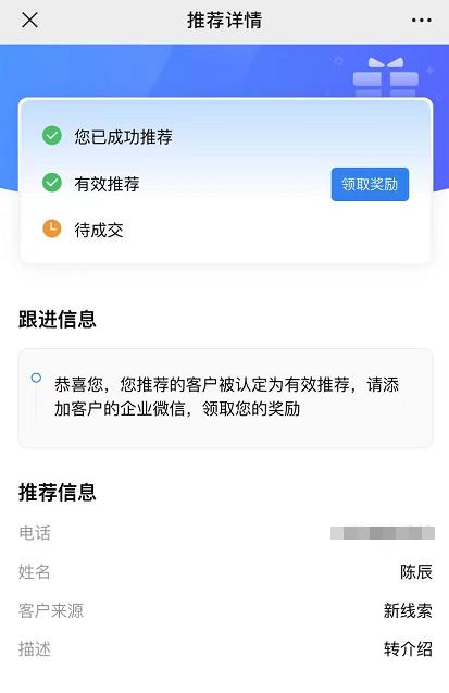 这不,探马SCRM推出了『推荐客户』的新功能。在有效推荐客户后,推荐人能领取相应的奖励,企业也能获得新线索或新客户,一举两得。
