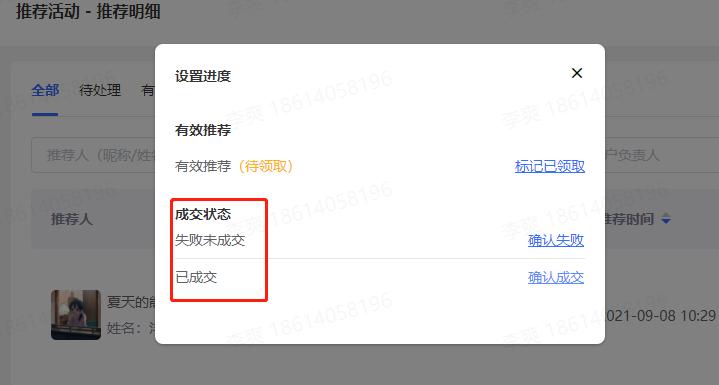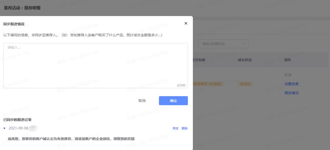 员工在后台判断推荐是否为有效推荐(成交),在处理完成后,可填写跟进说明,向用户说明推荐失败的原因或推荐成功后的客户进展等,随时告知推荐进度,过程透明化,让用户在转介绍的过程中感受更好。