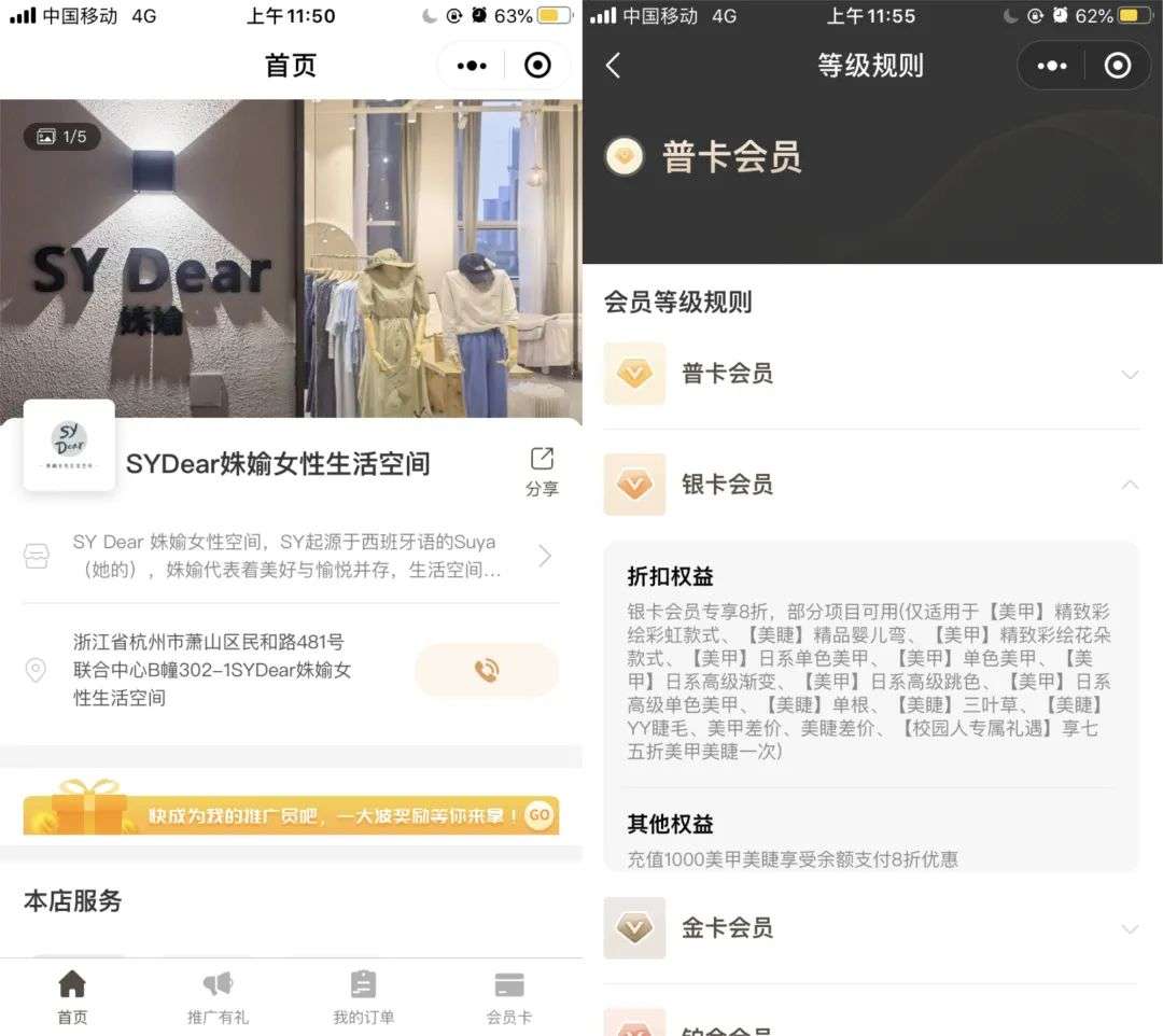 SY Dear姝媮为了更高效的活跃私域流量,利用凡科门店通中的会员系统开启了全周期的会员管理。推出了5个等级的会员卡,分别是普卡、银卡、金卡、铂金、钻石。