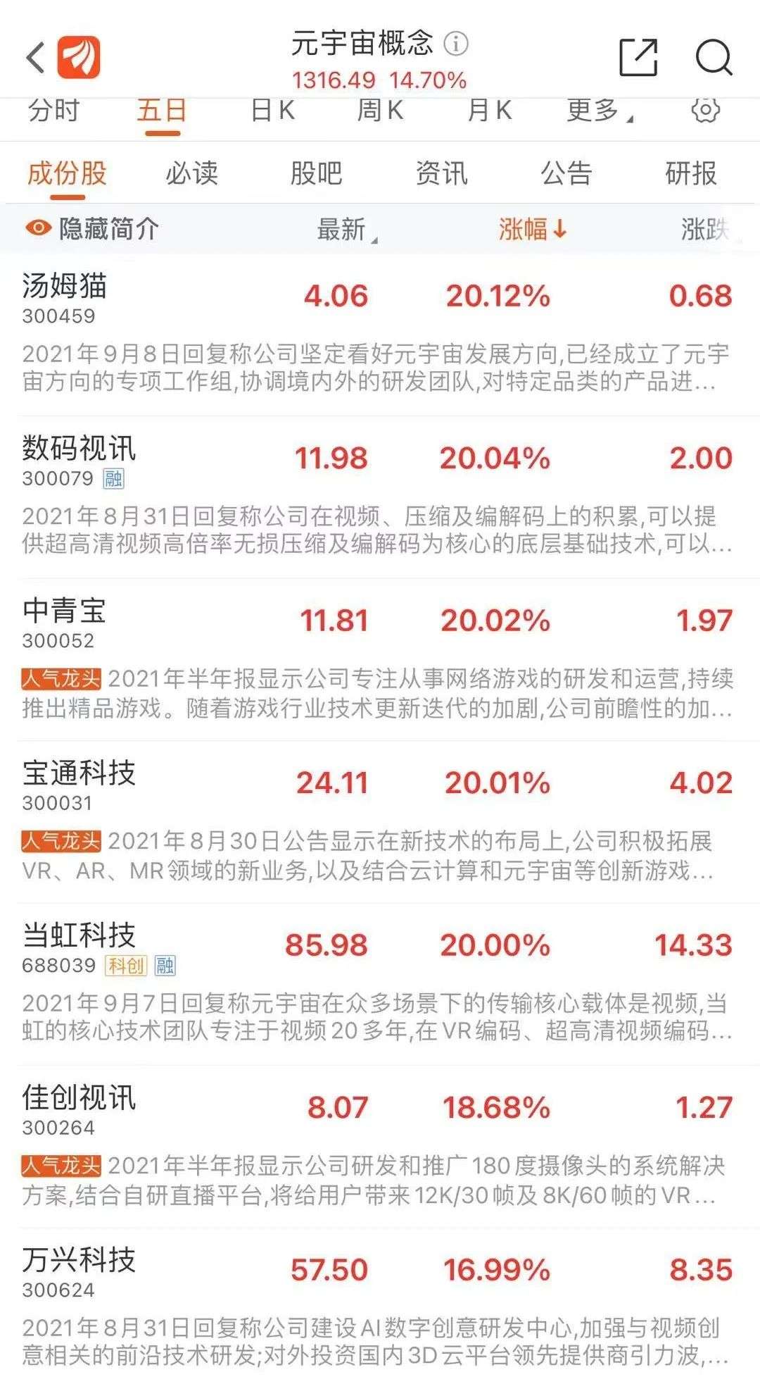 此外,元宇宙概念板块中的数码视讯、当虹科技、宝通科技跟随涨停,歌尔股份、昆仑万维、世纪华通、三七互娱、完美世界等也纷纷大涨。