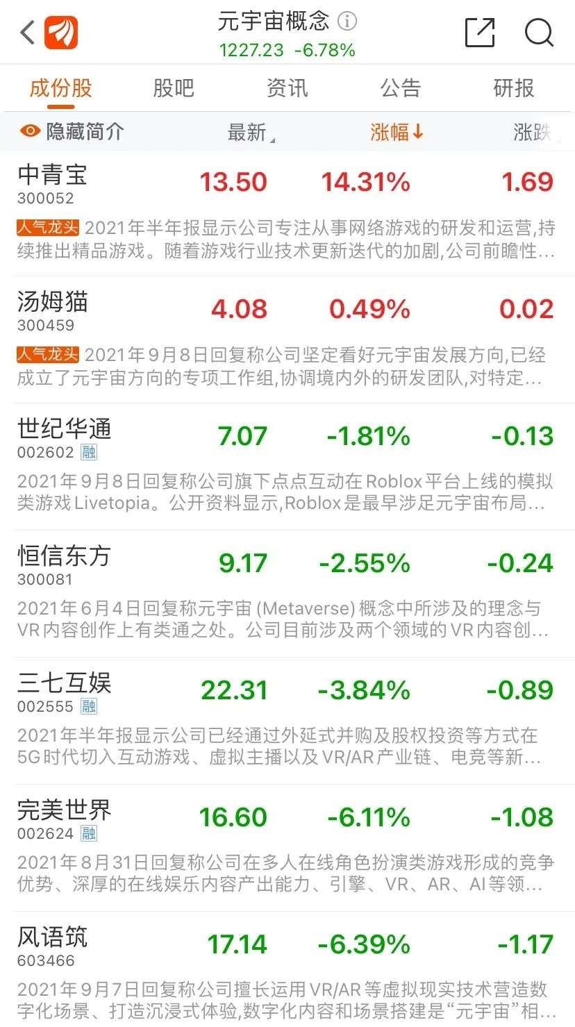 不过,到了9月10日,元宇宙概念再次热了起来。截至发稿,中青宝、汤姆猫涨势依旧,其中中青宝一度上涨超9%。此外,当虹科技、宝通科技、世纪华通、数码视讯等也略微上涨。