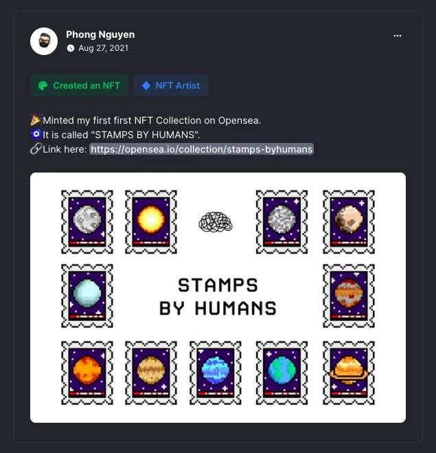 一位 Polywork 用户的动态,铸成自己的首个 NFT 系列「人类邮票」,我很想随手点个赞但产品不让