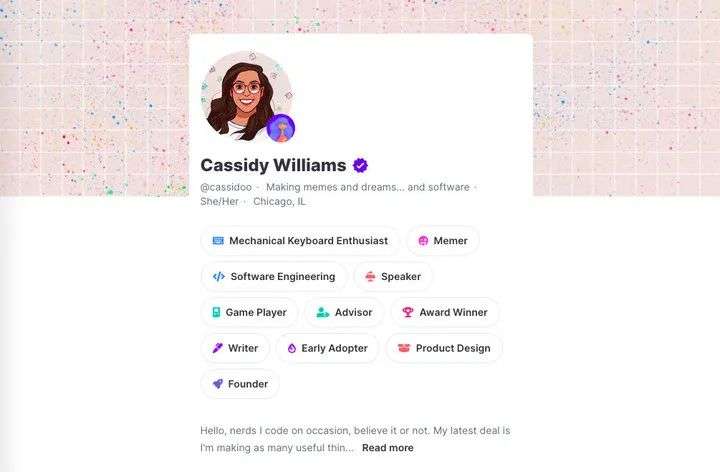 Polywork 用户 @miffens 称,「我一直以为自己很单调乏味。而个人主页上的各种徽章,让我以一种不一样的、积极的方式看待自己。」我也有同款体会。