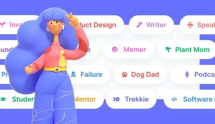 这些混乱但生动的描述,你很难在强调专业、古板严肃的职业社交平台上看到。而在 Polywork 的产品设计逻辑中,你为自己选择的身份徽章,展示位置甚至优先于你的自我介绍和工作经历。