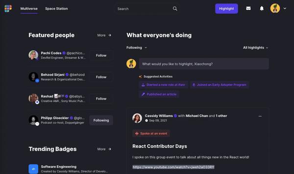 相比之下,Polywork 的界面要更简洁得多。除了你的个人主页,Polywork 主要打造了两个不同的社交场景:多元宇宙(Multiverse)和空间站(Space Station)。