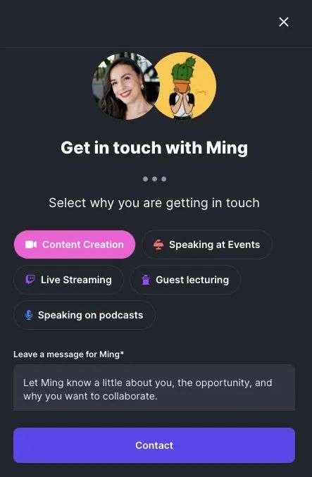 在设置个人主页的时候,每个用户都可以选择是否愿意跟陌生人接触,就某些机会和项目进行协作。你需要表明来意,留下必要信息,才能跟对方产生直接的沟通和联系(相当于站内私信的功能)。