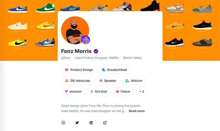比如说,Polywork 用户@fonz 是 Netflix 的产品设计师,也是「运动鞋迷」「投资人」「播客主播」和「女儿的爸爸」。