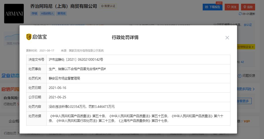 据启信宝,就在今年6月,乔治阿玛尼(上海)商贸有限公司新增一则行政处罚,处罚事由为生产、销售以不合格产品冒充合格产品,处罚结果为没收违法所得235.4元,罚款3.446473万元,决定文书号沪市监静处〔2021〕062021000142号,处罚单位为静安区市场监督管理局。