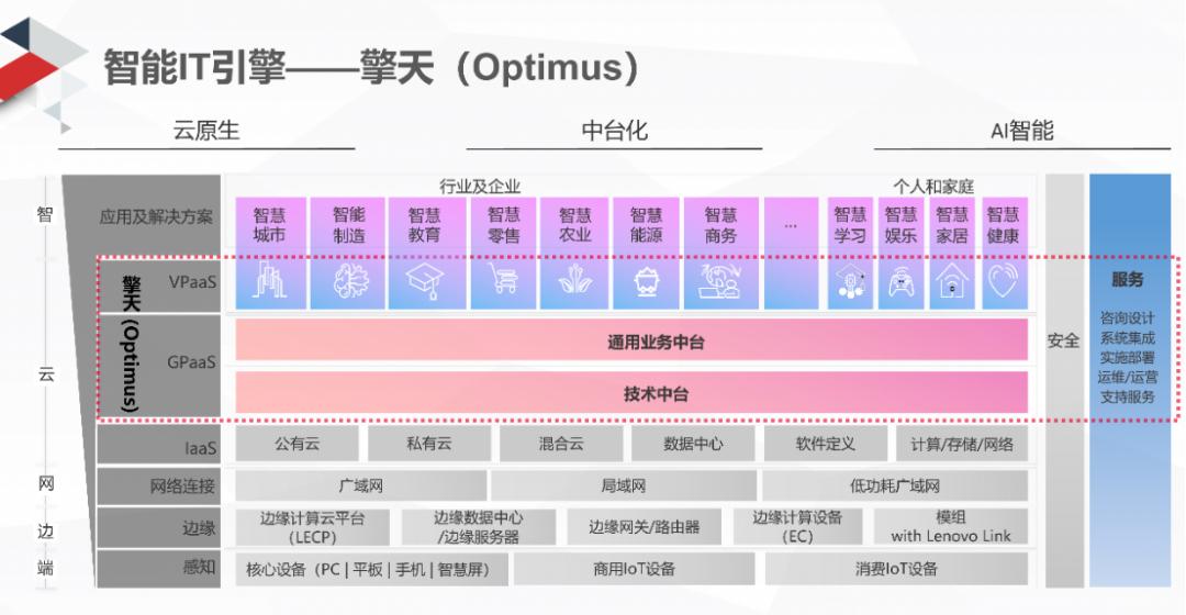 具体来说,过去一个时期,承载联想“端-边-云-网-智”这一智能经济全生产力要素能力的核心输出平台,是联想中国新IT实践打磨而成的智能IT引擎——“擎天-Optimus”。