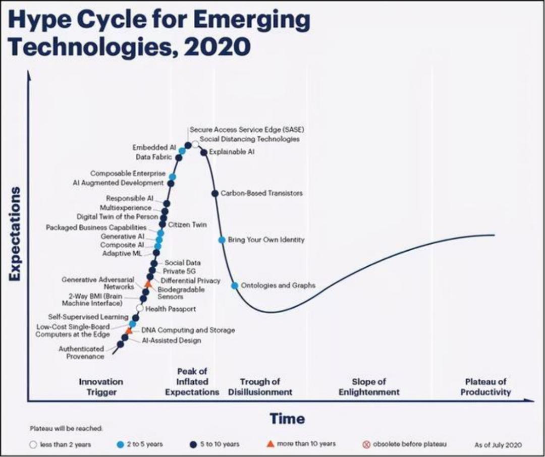 图:Garnter 2020新兴技术成熟度曲线显示,绝大多数智能经济相关的技术都将在未来的2 -3年进入爬升的光明期。来源:Garnter