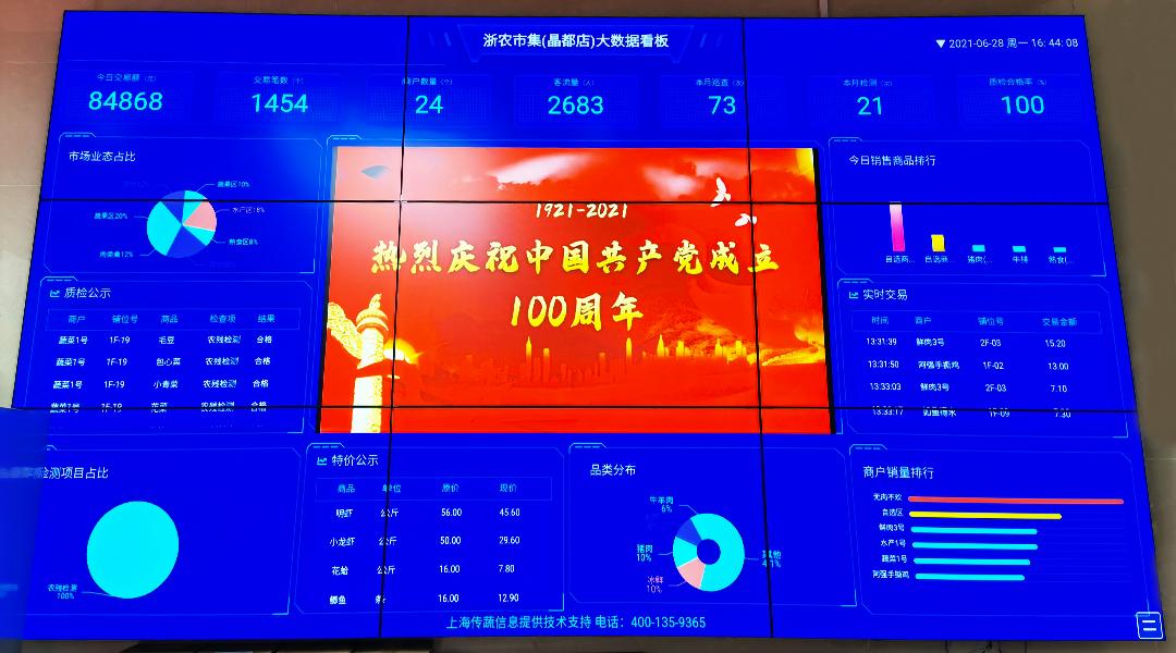 晶都新农贸铺设了多种传蔬提供的智慧终端,为顾客提供更多体验的同时,也实现了市场的透明化监管。晶都市场进门处配置有3*3的拼接大屏,可实现信息展示、政策宣传等多方面功能,做活动时还能放映节目和电影。另外还有多个点位的立式导视屏,吸引顾客驻足观看或点击互动。通过智能终端与互联网、物联网、云计算等技术的结合,晶都市场实现了市场人流情况、销售情况、巡检信息、质检信息、品类占比等各个方面数据的全面展现,让市场管理方、监管单位、消费者都能清晰了解市场运营和管理的基本情况。