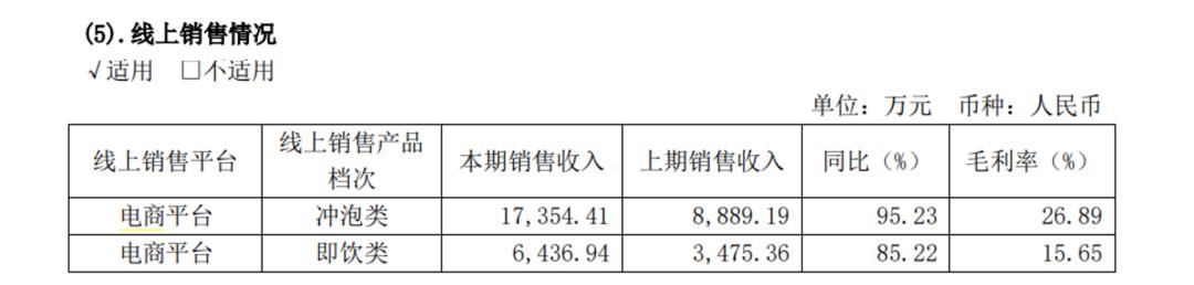 报告期内,即饮类奶茶收入达到4.12亿元,占总收入的38.44%,与上年同期相比不升反降。毛利率方面,18.35%的水平甚至不及传统冲泡业务40.61%的一半,丝毫显示不出第二引擎应有的能量。