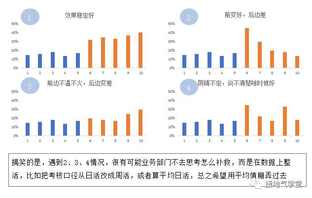 所谓稳定,指的是考核结果要稳定地表现为“好”。举个简单的例子,做一个促活的活动,理论上,最好的结果是下图1所示,上线后,活跃率稳定的高。下图2、3、4,都是所谓的“不稳定”场景。