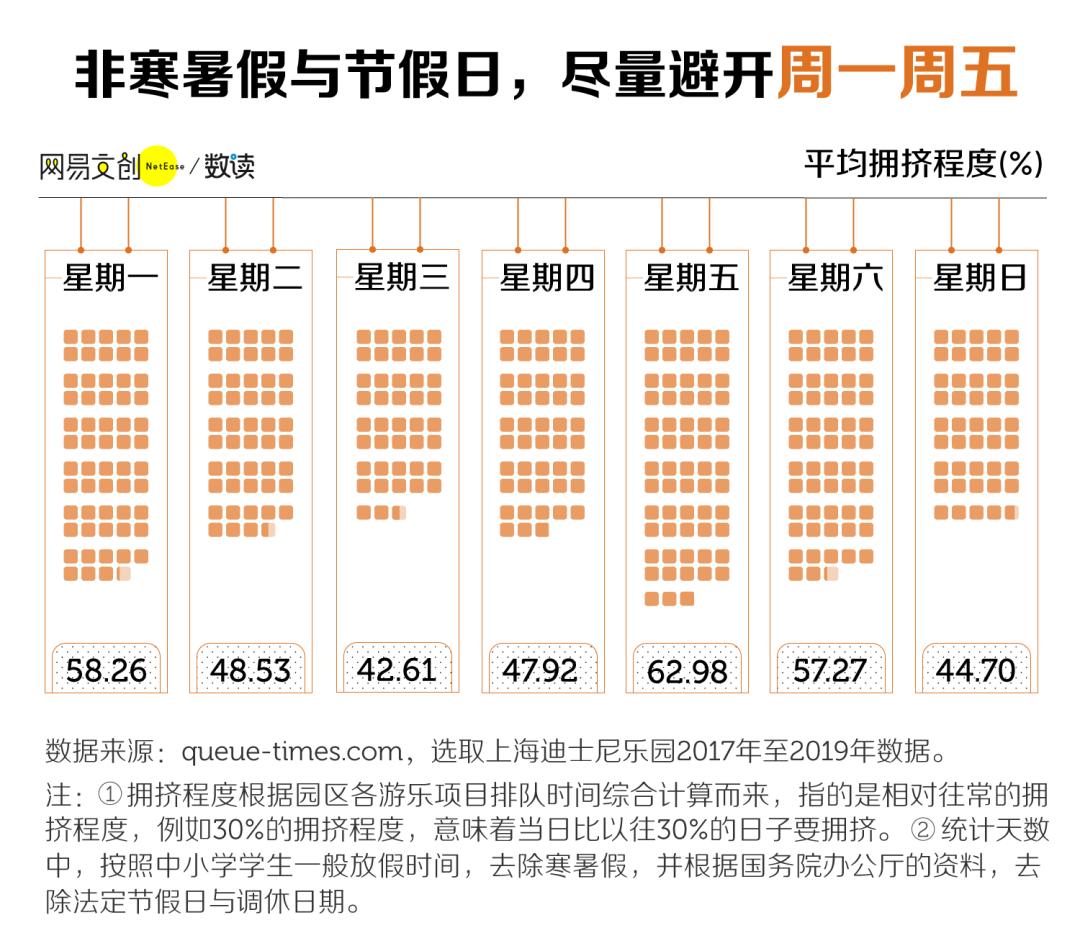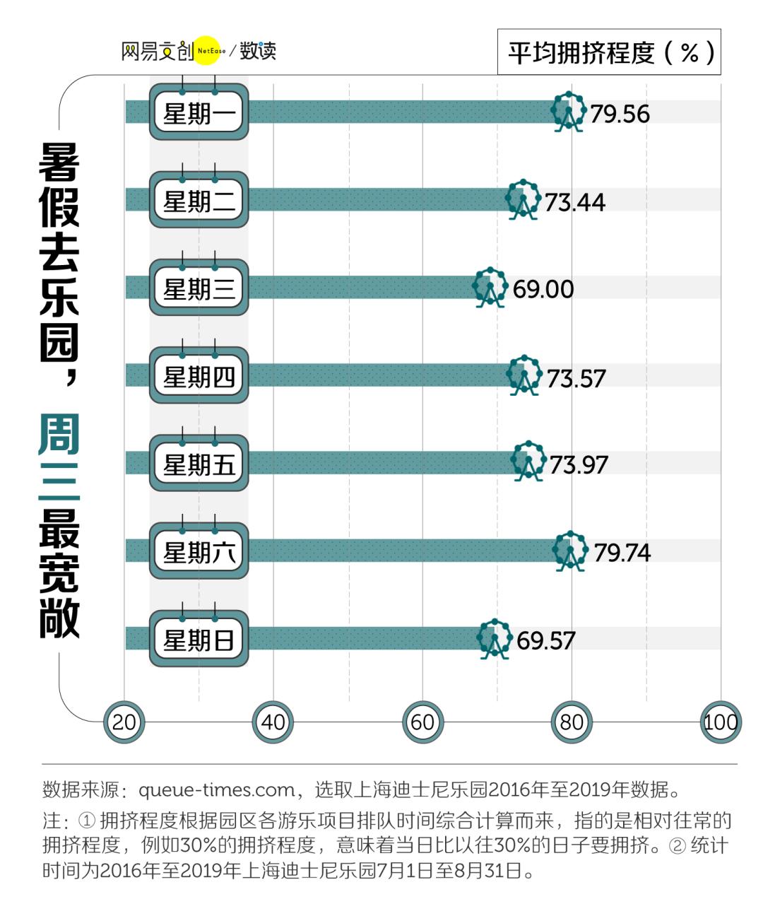 我们发现,哪怕你选择暑假去主题乐园,周三依旧是个好选择,拥挤程度比其他日子略低一筹。