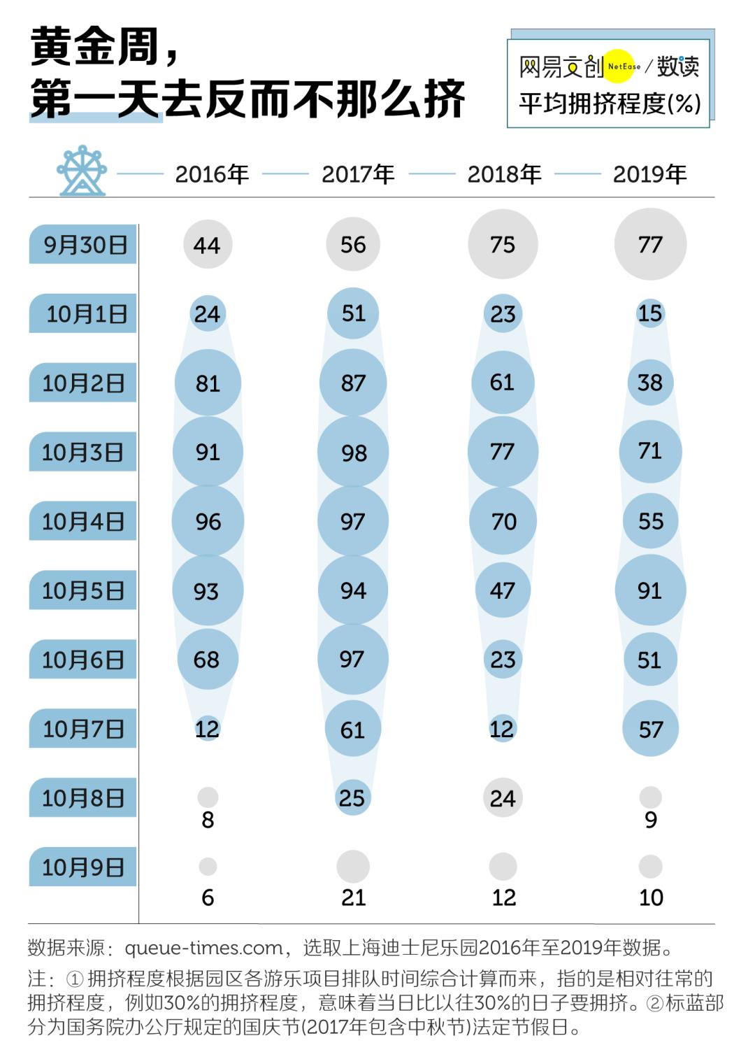 根据 2016 年到 2019 年上海迪士尼乐园国庆前后的人流数据,10 月 3 日到 10 月 5 日,是迪士尼国庆最拥挤的时候。2017 年,国庆与中秋假期连放,上海迪士尼的高峰期延长到了 10 月 6 日。