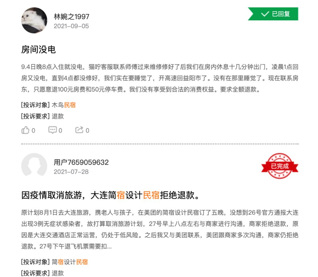 在新浪旗下的黑猫投诉平台上,搜索民宿,关于民宿的投诉高达13581,尤其是疫情后的这段时间,网友因疫情退款、退款改价、给差评后被骚扰等方面的投诉激增。而在疫情前,引起投诉的往往是实际体验差。早在2017年,苏州在3·15之前发布了一份投诉报告,全市各级消保委组织共受理消费者投诉12395件,而在535件食宿类投诉中,涉及民宿的有105件,占了该类投诉的近20%。