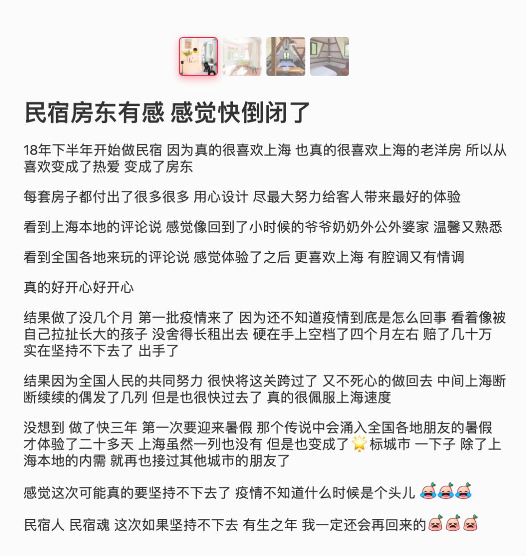 2016年,90后女孩木木在天津陆续开办了6家民宿,本来准备2020年再扩张几家,但疫情打破了计划,她的6家民宿中,3家濒临倒闭,剩下的也“快撑不下去了”。济南民宿主阿杰入行三年有余,去年五一期间迫于无法承受的资金压力,决定“割肉”离场。