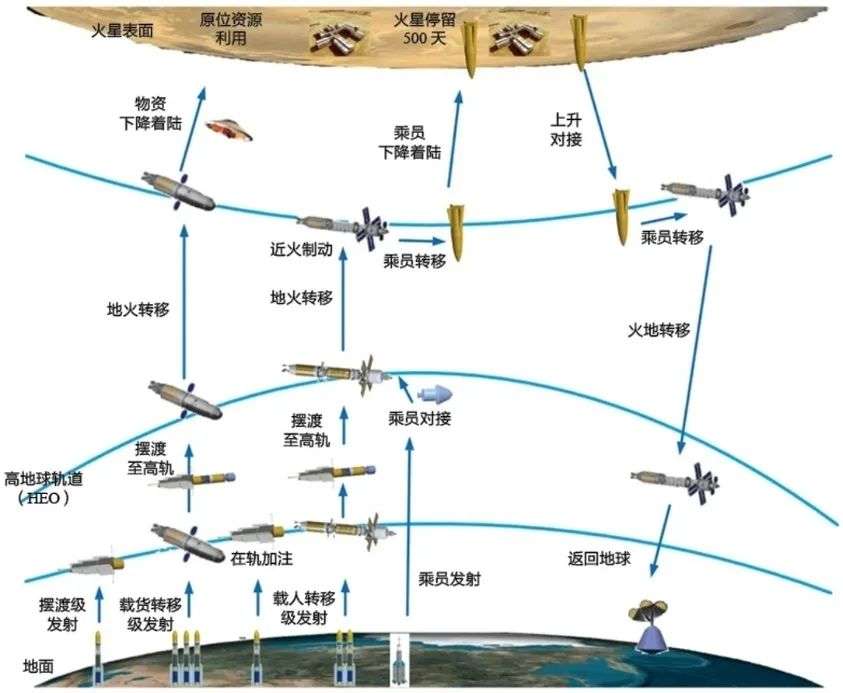 航天一院院长王小军介绍和分析过我国载人登火任务的初步方案。任务可能于2030至2040年代开展,计划采用安全性高的人货分运模式,地火转移从高地球轨道(HEO)出发。