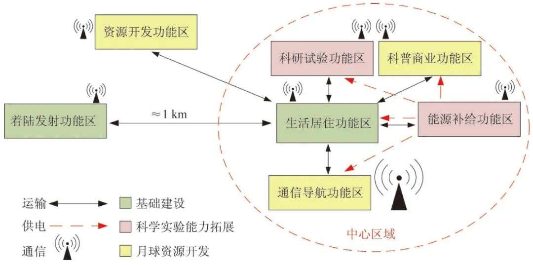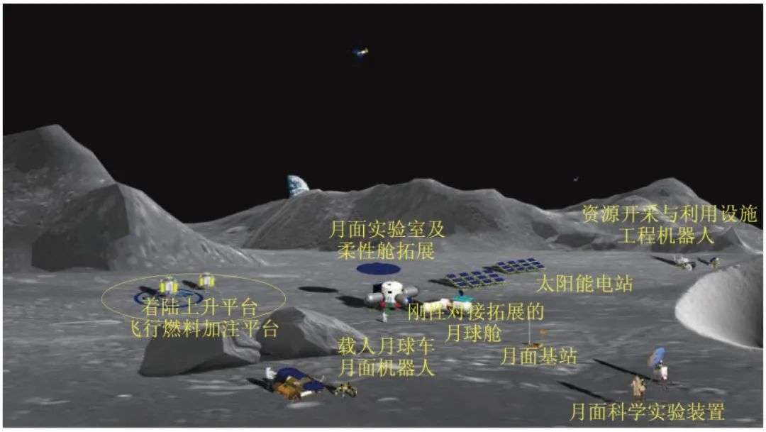 月球科研站阶段。通过人货分落形式,逐步建设起长期运行的月球科研站,根据任务需求可设立多个功能区域。[4]