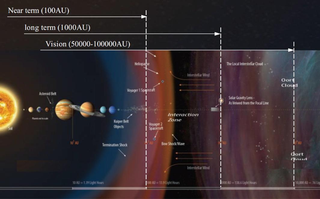 未来发展的愿景目标为突破1万AU飞行技术,对5~10 万AU的太阳系引力边际,开展恒星际探测并取得重大科学发现。[13]