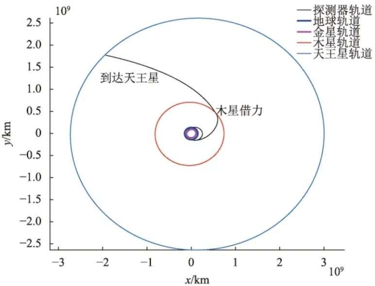 为使行星际飞越器能在2049年前飞越天王星,飞行过程中将多次飞掠行星借力加速,最佳的最佳的引力弹弓飞行序列为EVEEJU,即由地球出发后依次飞掠金星、地球、地球、木星,最终飞掠天王星)。[10]