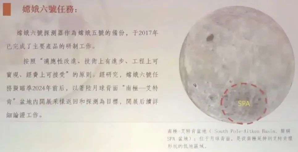嫦娥六号为嫦娥五号备份,2017年已完成研制工作,计划着陆月球背面南极-艾特肯盆地(嫦娥四号着陆地),执行月背采样返回任务,这将是继嫦娥五号后的第二次月球采样任务。