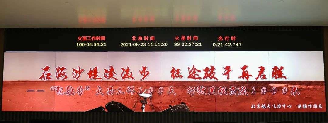 北京航天飞行控制中心庆祝“祝融号”工作100天的大红屏 | BACC/微博@北京蓝龙