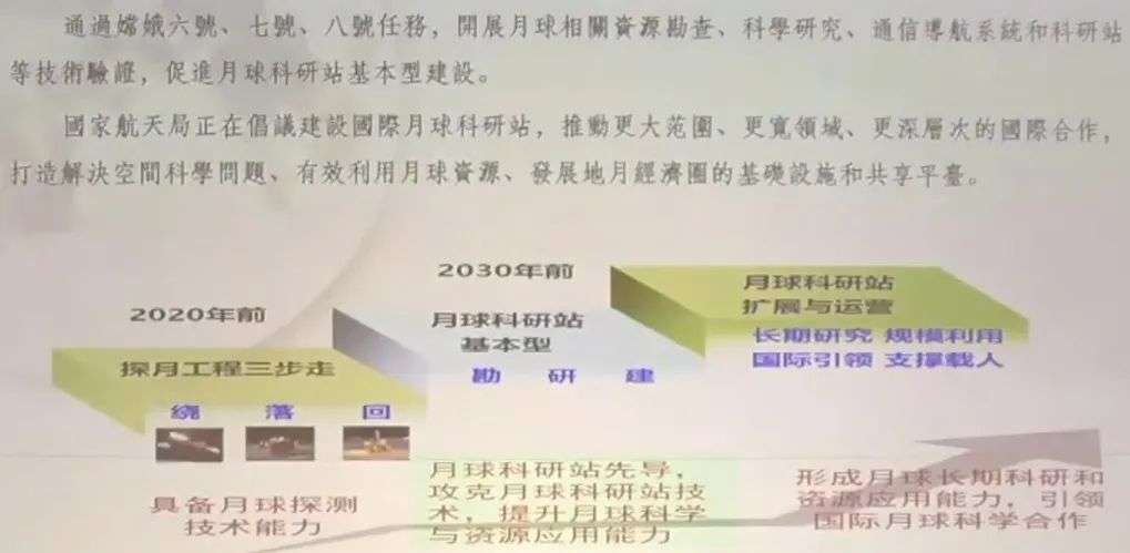 月球探测已完成“绕、落、回”三步走,未来将考察月球南极,建立国际月球科研站,实施载人登月;