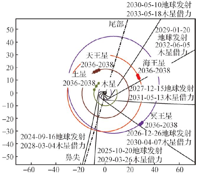 满足任务约束的太阳系边际探测飞行序列及飞行轨道示意图 | 论文[14]