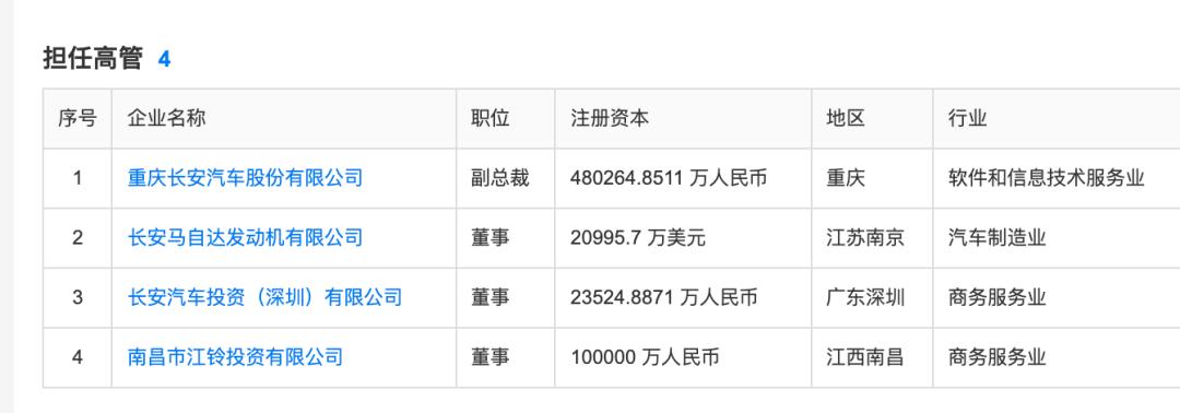 启信宝数据显示,余成龙不仅在长安汽车担任副总裁,也在长安马自达发动机有限公司、南昌市江铃投资有限公司以及长安汽车投资(深圳)有限公司担任董事职务。