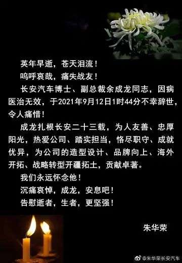 9月12日,长安汽车公告,公司副总裁余成龙因突发疾病,医治无效不幸去世。公司董事会对余成龙先生生前为公司所做的努力和贡献衷心感谢,公司董事、监事、高级管理人员及全体员工,对余成龙先生的去世深表惋惜并致以沉痛的哀悼。